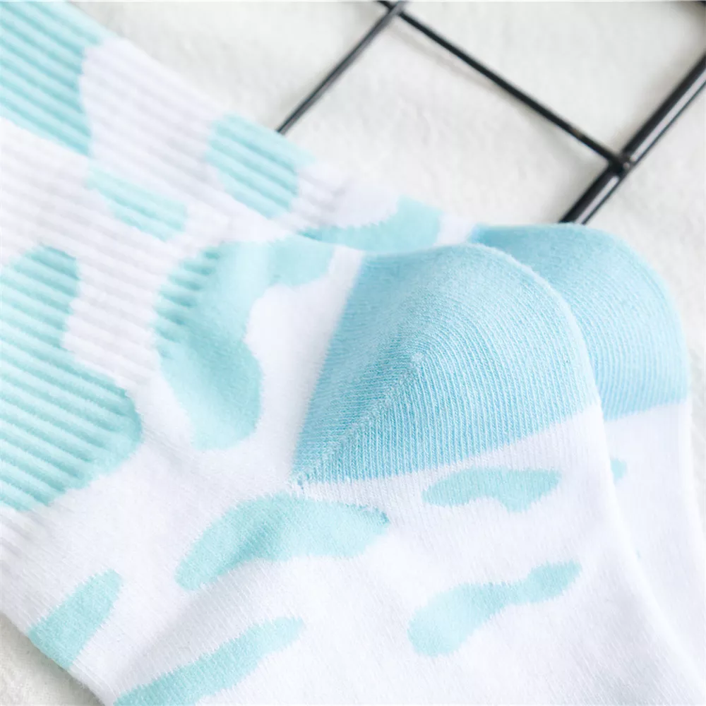 Step into the season with these charming Harajuku-inspired cow print summer socks, designed to bring a splash of fun and freshness to your everyday outfits. Featuring soft pastel tones in pink, blue, and purple, these socks blend adorable cartoon style with the cozy feel you love. Made with a breathable mix of cotton, polyester, spandex, and nylon, they offer a smooth knit finish and a comfortable middle-tube height that’s perfect for daily wear.