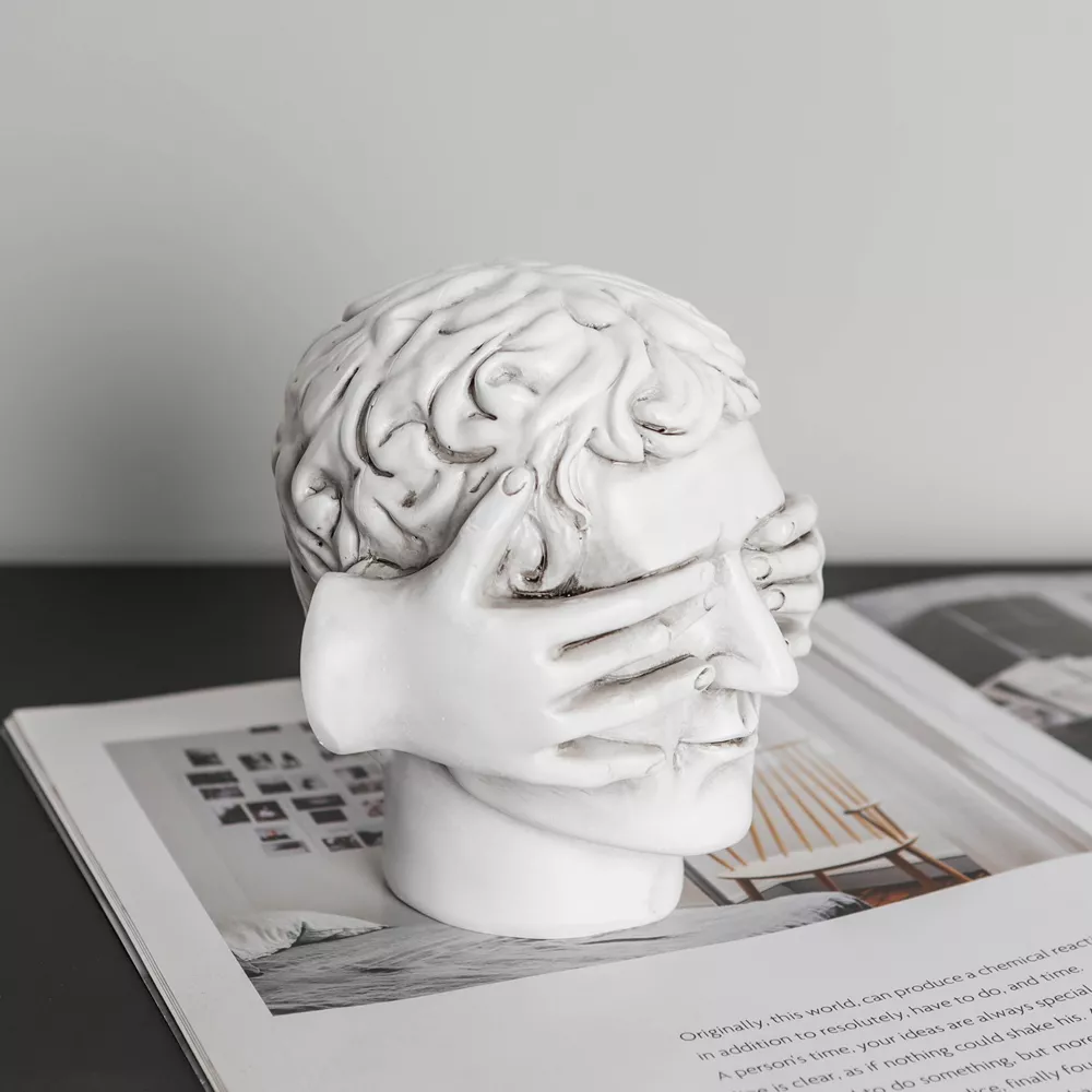 - Design: Handcrafted head sculpture with realistic detailing and a unique pose of hands covering the eyes.