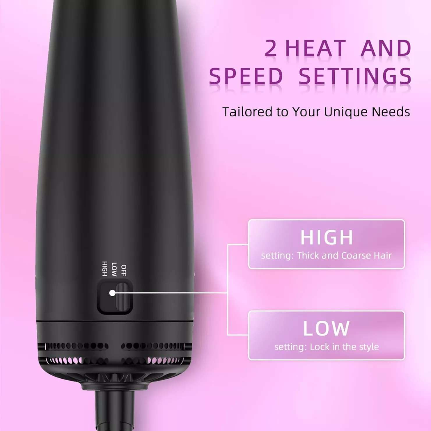 - Custom Heat & Speed – Two temperatures, cold wind, and two speeds.