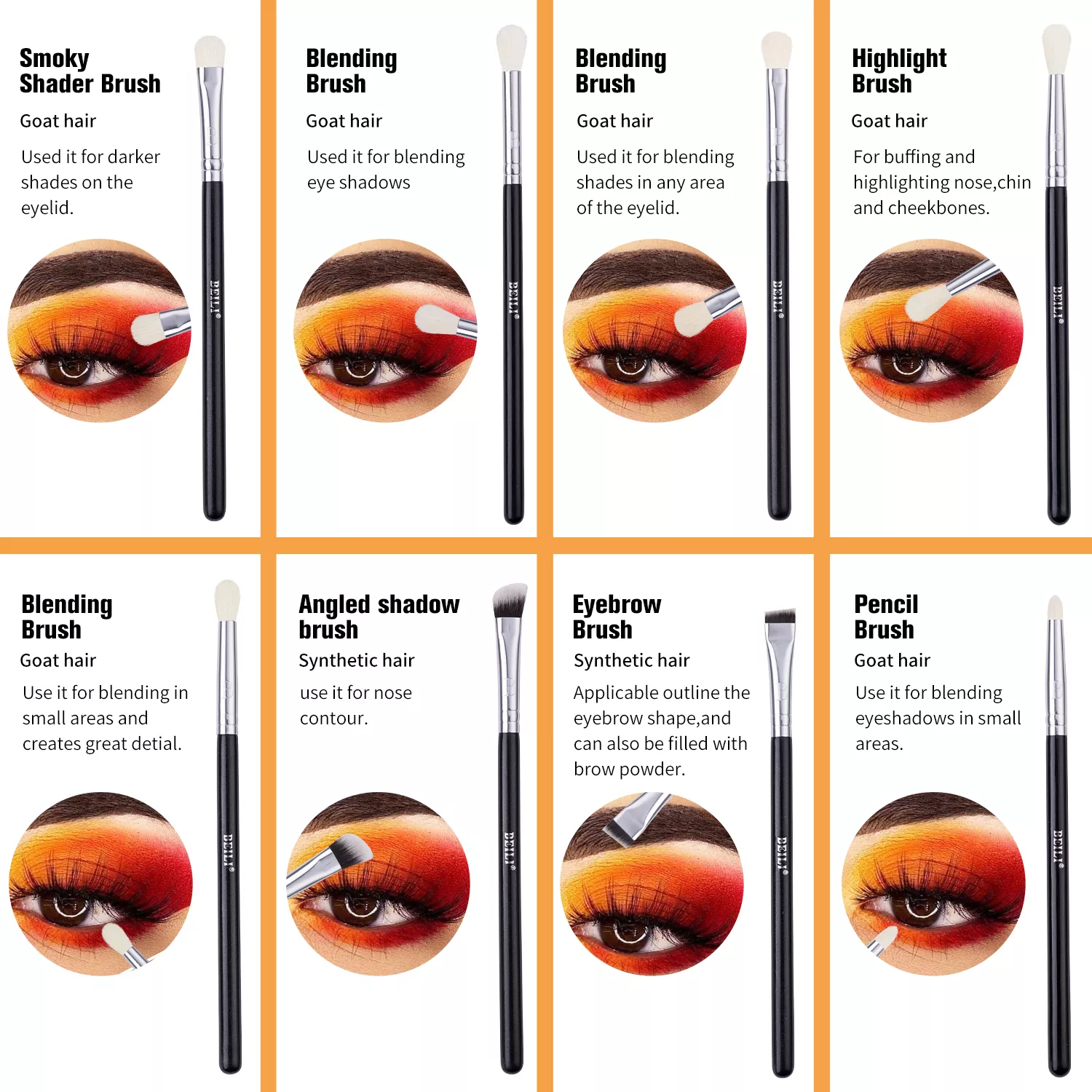 This collection includes six pieces of natural goat-hair brushes known for their softness and airy texture—perfect for blending, diffusing edges, and creating smooth transitions. Two additional synthetic brushes add versatility, offering precision for cream formulas, sharp lines, and detailed work. Each brush features a sleek wooden handle with a comfortable grip, giving you stable control for every sweep, dab, and blend.